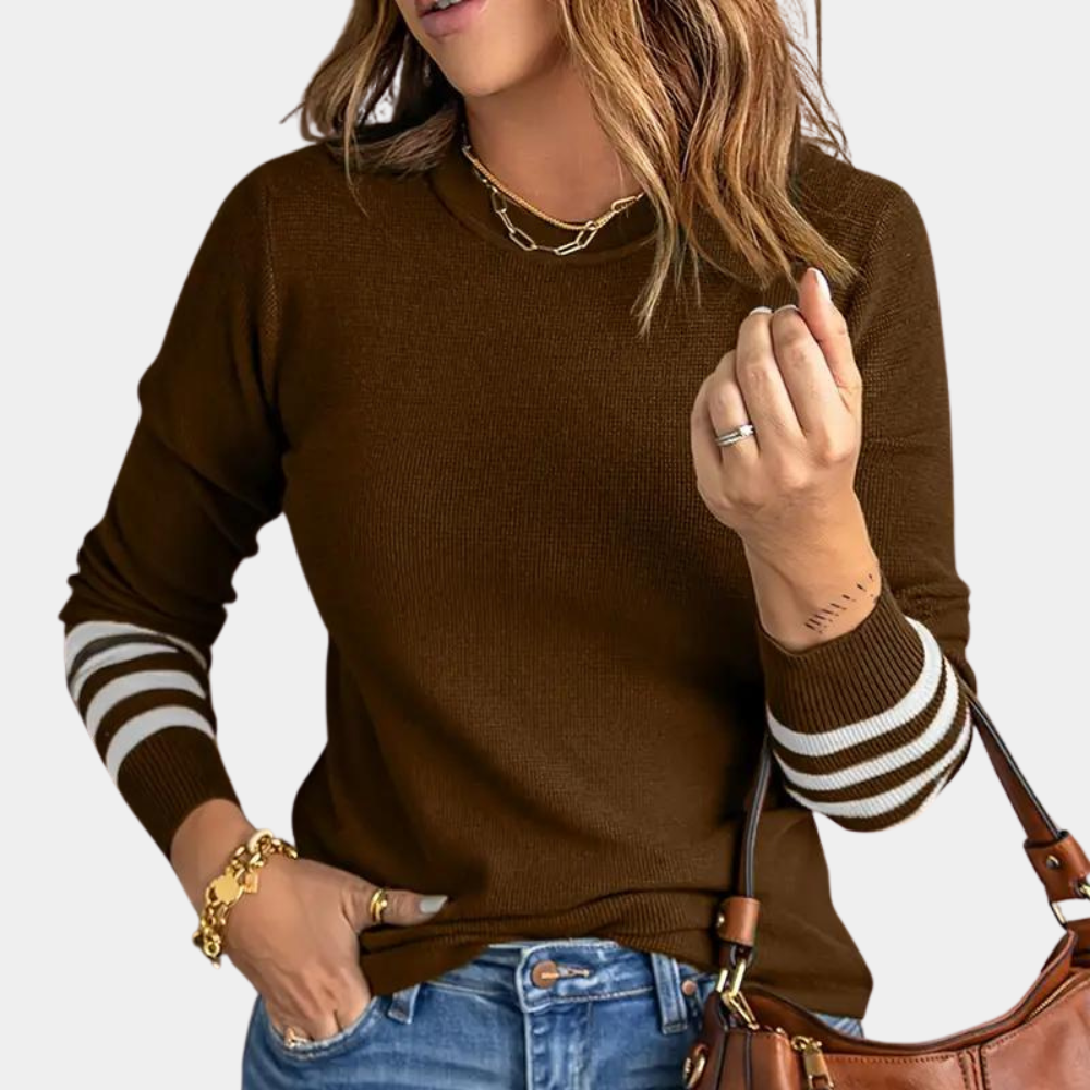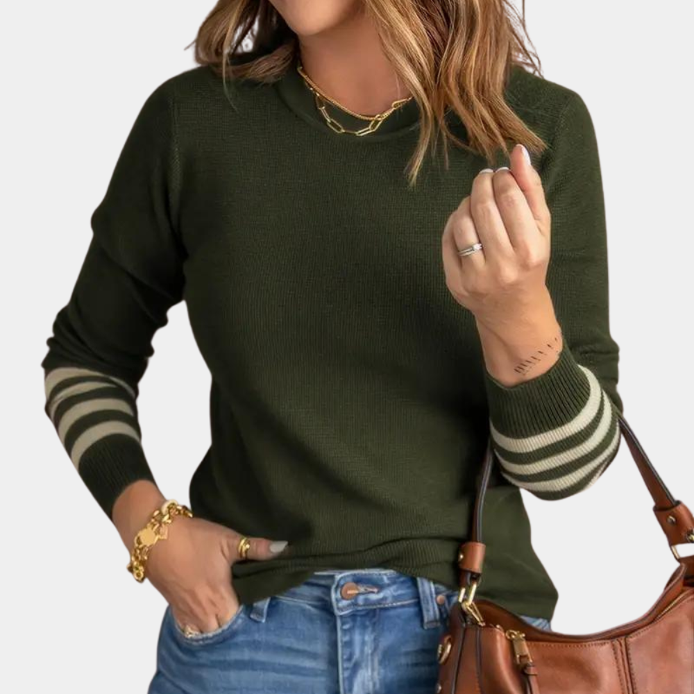 Dieser Damenpullover ist die ideale Wahl für modebewusste Frauen, die in ihrem Alltag nicht auf Eleganz verzichten möchten. Mit seinem modernen Design und den gestreiften Ärmeln ist er der perfekte Begleiter für Büro und Freizeit. Er bietet sowohl Komfort als auch eine ansprechende Optik, sodass Sie immer gut gekleidet sind.