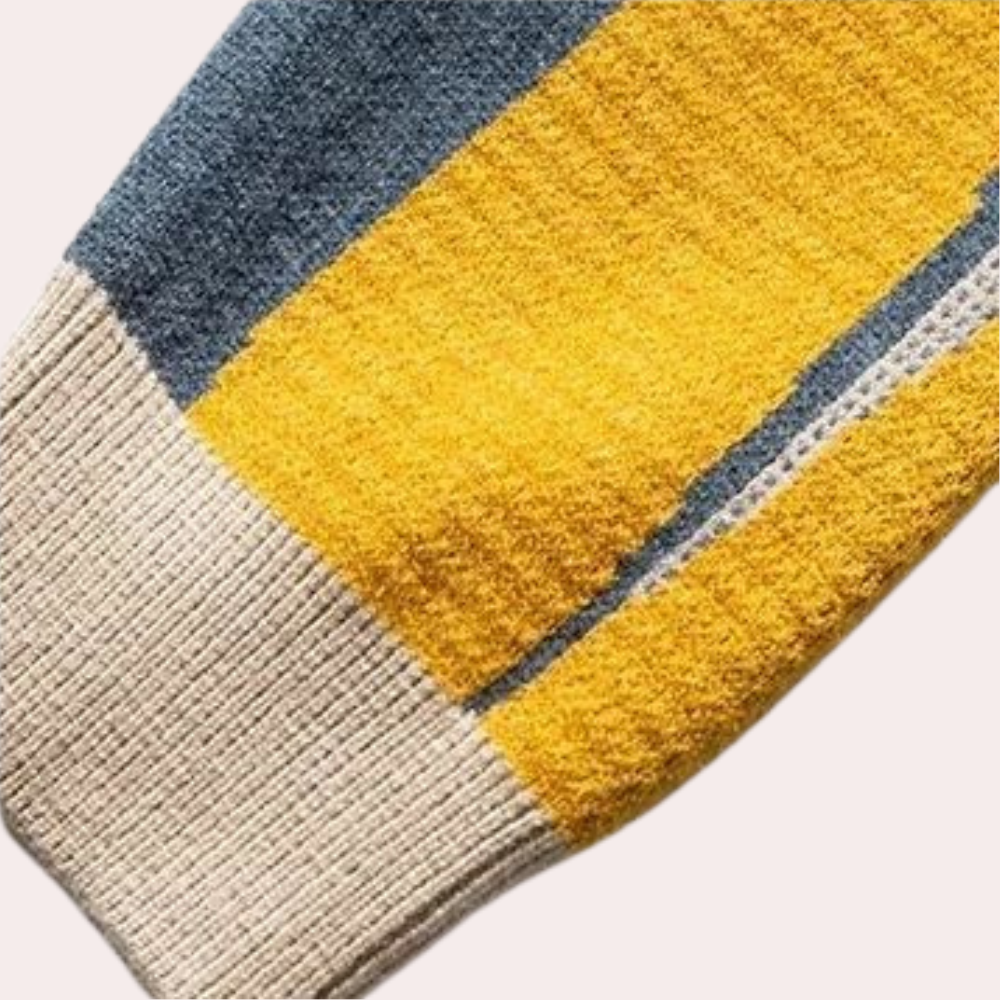 Um die Lebensdauer des Pullovers zu verlängern, wasche ihn bei niedrigen Temperaturen und lasse ihn an der Luft trocknen. Vermeide Bleichmittel und Trockenreinigungen, um die Farben und das Material zu schonen.