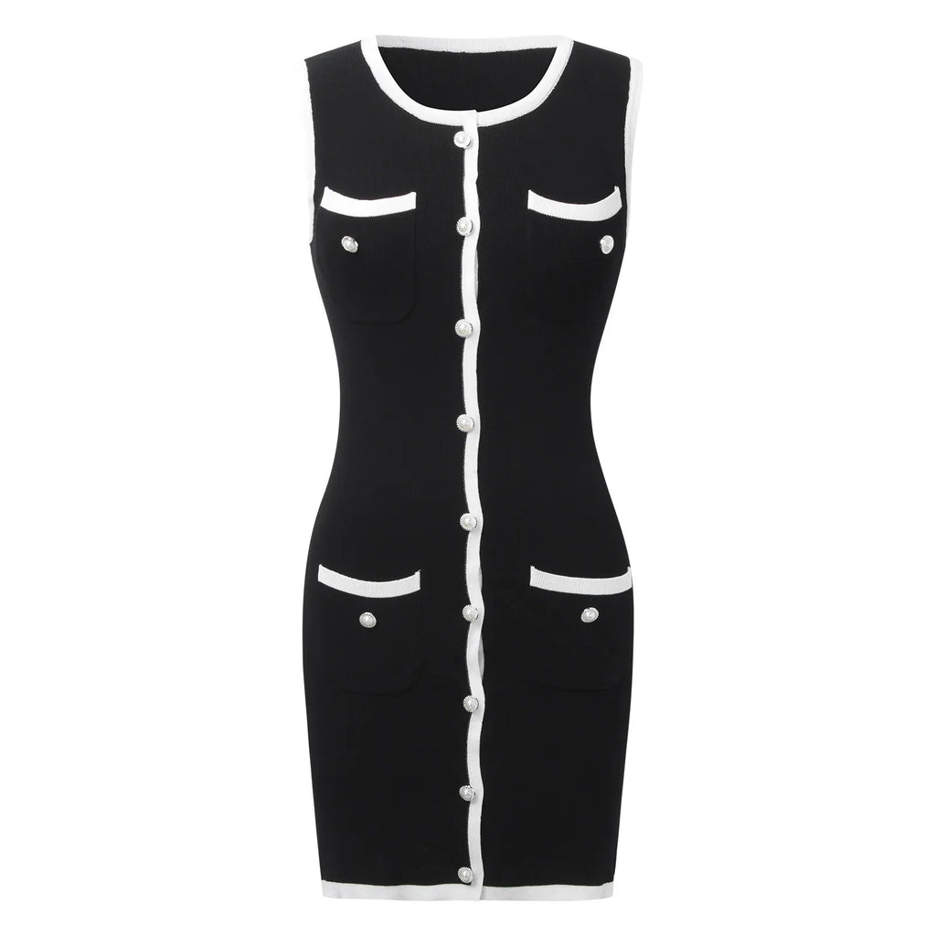 Dieses elegante Minikleid mit Kontrastbesatz und Knöpfen ist die ideale Wahl für Frauen, die sowohl bei Abendveranstaltungen als auch bei gehobenen Tagesanlässen glänzen möchten. Mit seinem einzigartigen Design und der maßgeschneiderten Passform ist es für jede modebewusste Dame ein Muss.