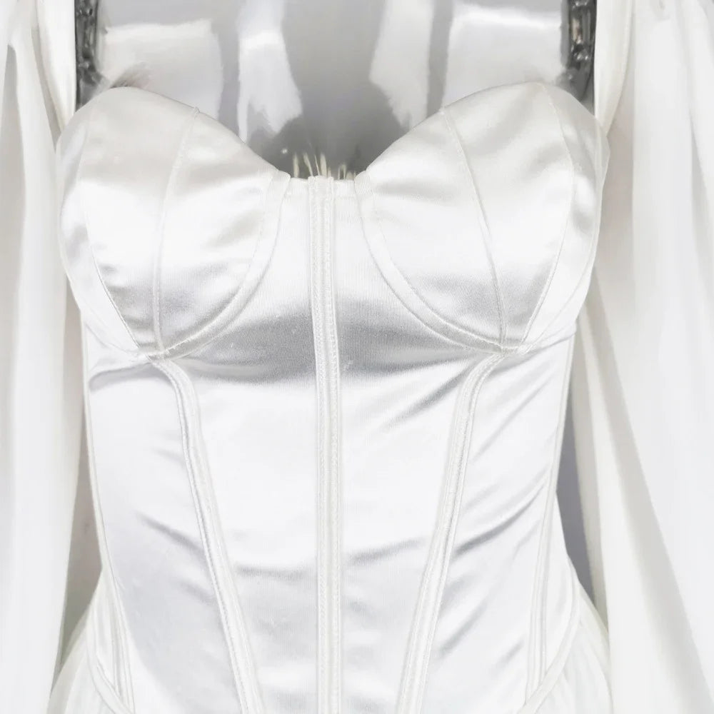 Dieses Kleid ist die ideale Wahl für Frauen, die Stil und Klasse schätzen. Mit einem zarten Satin-Stoff und einem trendigen Bustier-Design ist es sowohl schick als auch komfortabel. Die Puffärmel verleihen dem Kleid eine verspielte Note, die es perfekt für festliche Anlässe macht.