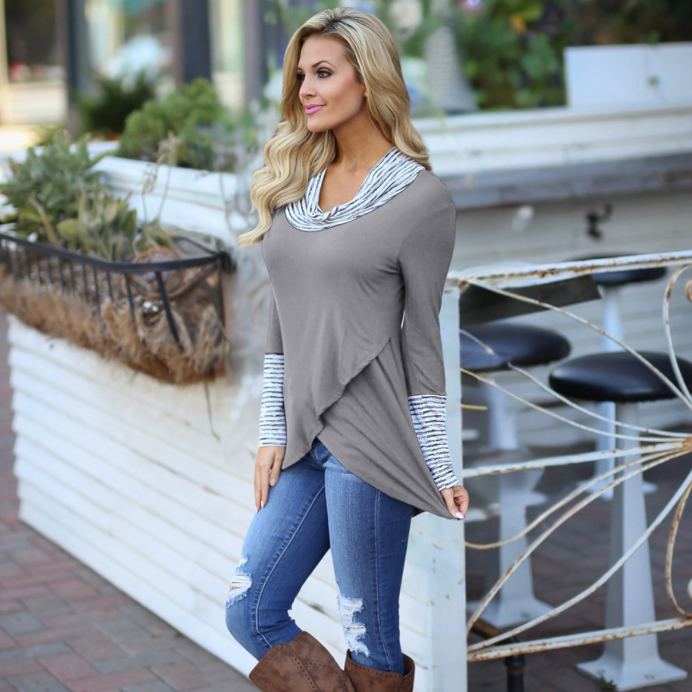 Dieses Oberteil ist die perfekte Wahl für Frauen, die Eleganz und Komfort schätzen. Mit seinem überlappenden Saum und den langen Ärmeln kombiniert es modernes Design mit hoher Funktionalität. Ideal für entspannte Tage oder besondere Anlässe, bietet es die perfekte Balance zwischen Stil und Bequemlichkeit.