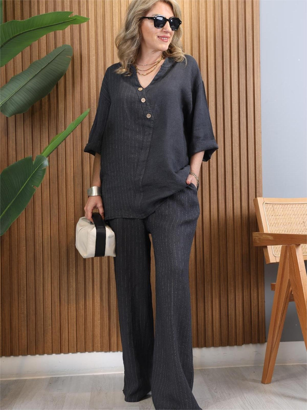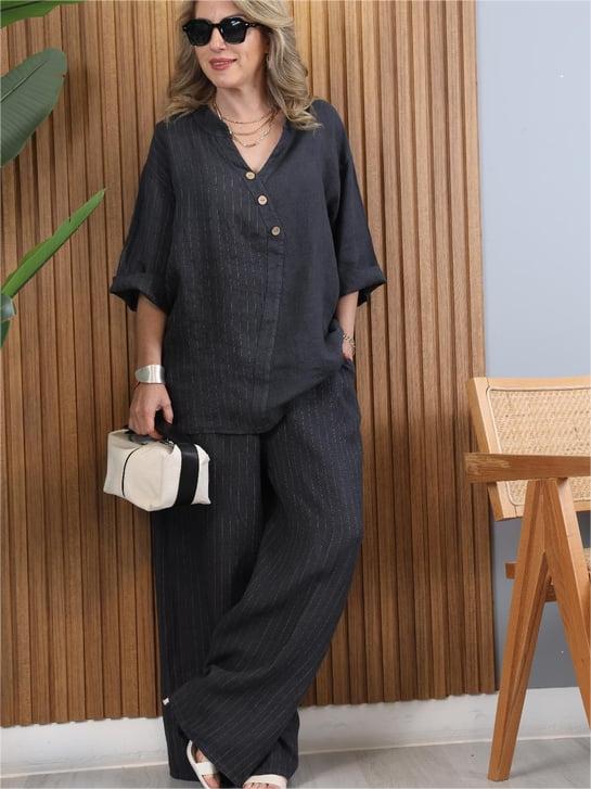 Dieses modische Ensemble kombiniert einen asymmetrischen Oberteil mit weit geschnittenen Hosen und ist perfekt für die moderne Frau. Egal ob im Büro, beim Treffen mit Freunden oder bei besonderen Anlässen, dieses Outfit sorgt immer für einen stilvollen Auftritt. Es bietet nicht nur einen trendigen Look, sondern auch hervorragenden Komfort, sodass Sie sich den ganzen Tag wohlfühlen.